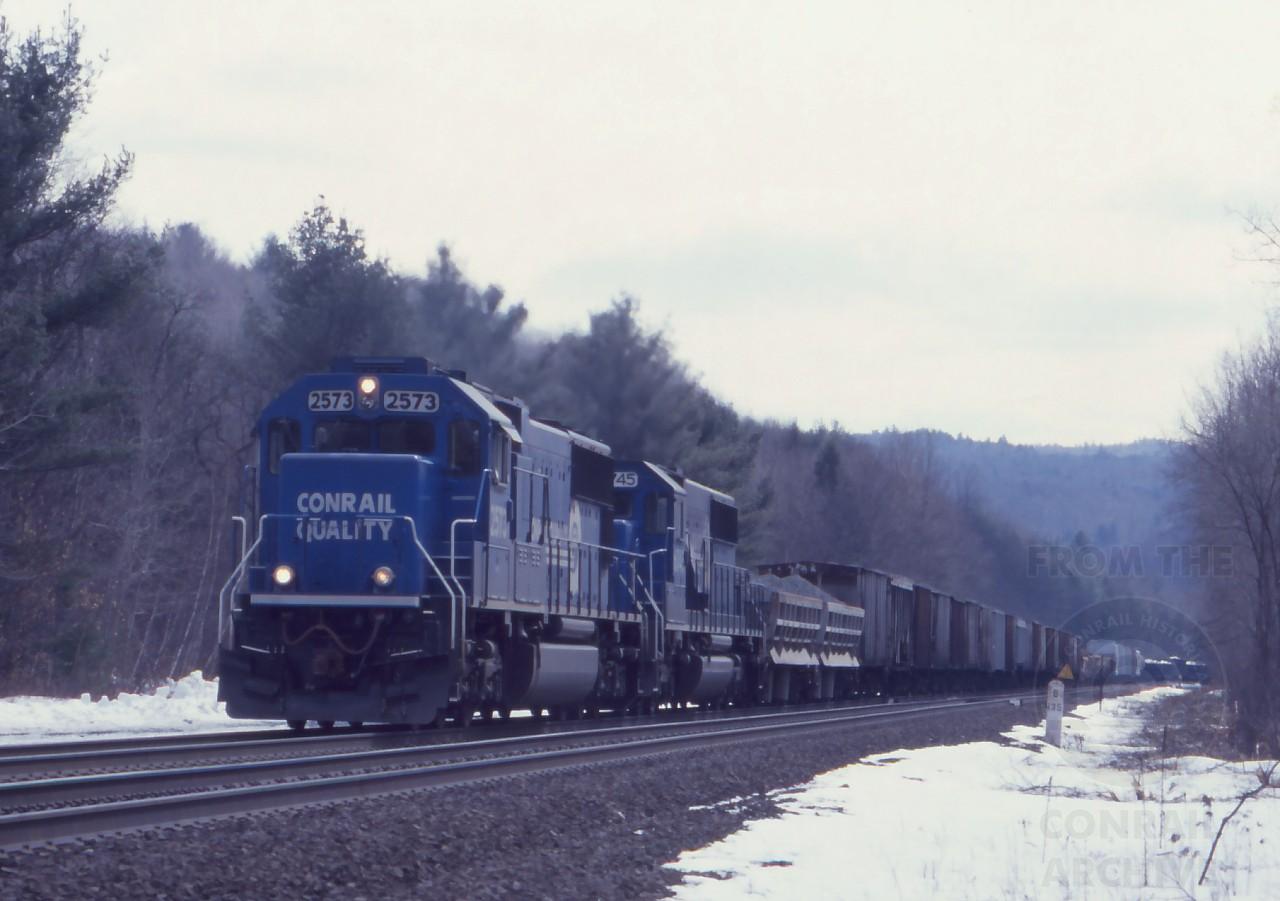 Because of it's rarity up here, BOSE-X was worth a chase to get another crack at SD70 2573 as he works up by Ballou's on Feb. 20, 1999.