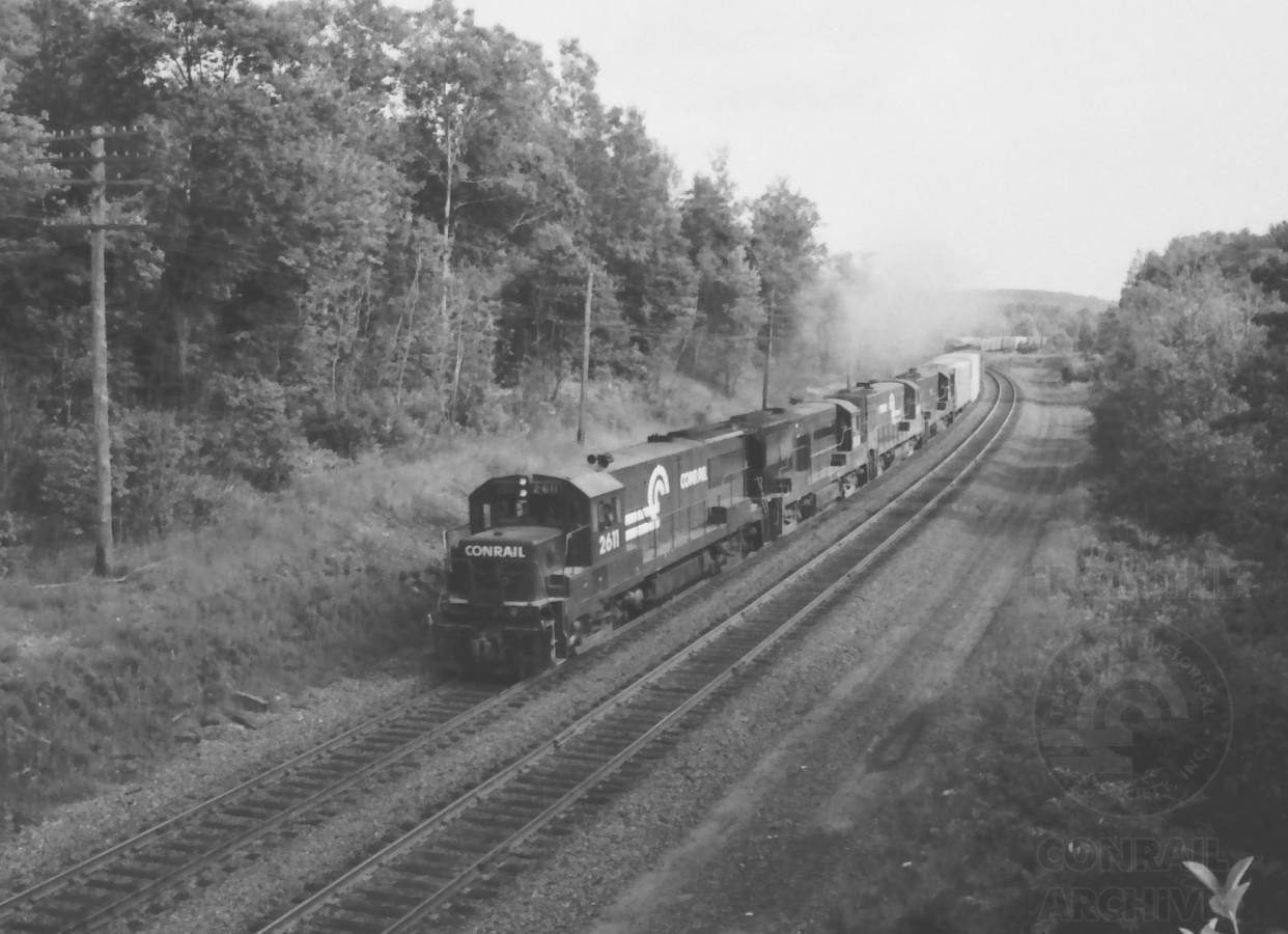 U25B 2611 leads another pair of like models plus a U28B on westbound tonnage at the summit of the Berkshires in Hinsdale, MA. on July 20, 1979.