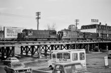 Ex-PC(NH) U25B 2673; ex-PC U33B 2894; and ex-PC(NYC) U25B 2548 take a westbound empty autorack job across the low trestle over US 202 in Westfield, MA on the Boston Line in February, 1977.