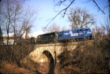 U23B #2704, SD45 #6154 (ex Penn Central) on P&E with east freight bound for Enola on March 23, 1980.