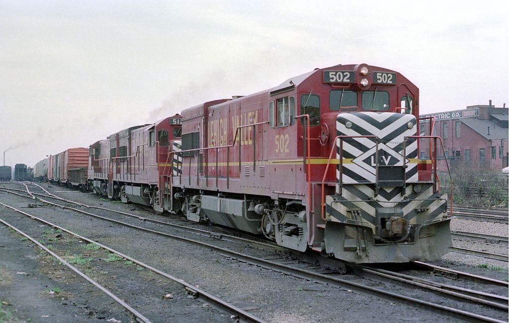 A set of 3 Lehigh Valley U23B's work the former PRR/PC South Akron yard with OM-8. This was the first non-PC or EL power to show up on the new ConRail in Akron- only 3 days into April 1976. LV 502 would become CR 2778.