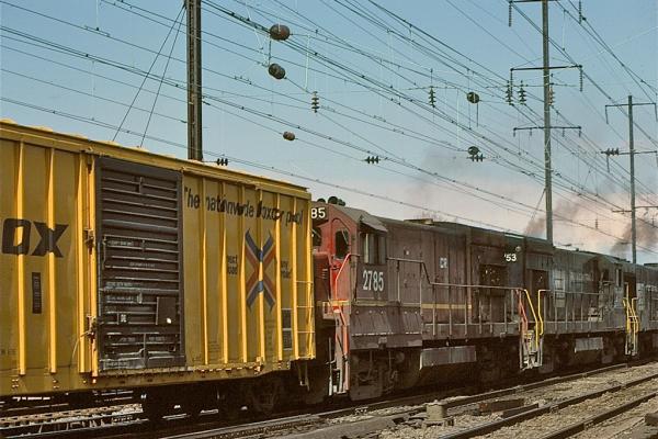 CR U23B 2780 (ex-LV 504) follows former PC GP38-2 8042 in a four unit lashup crossing Rockville Bridge in June, 1977.