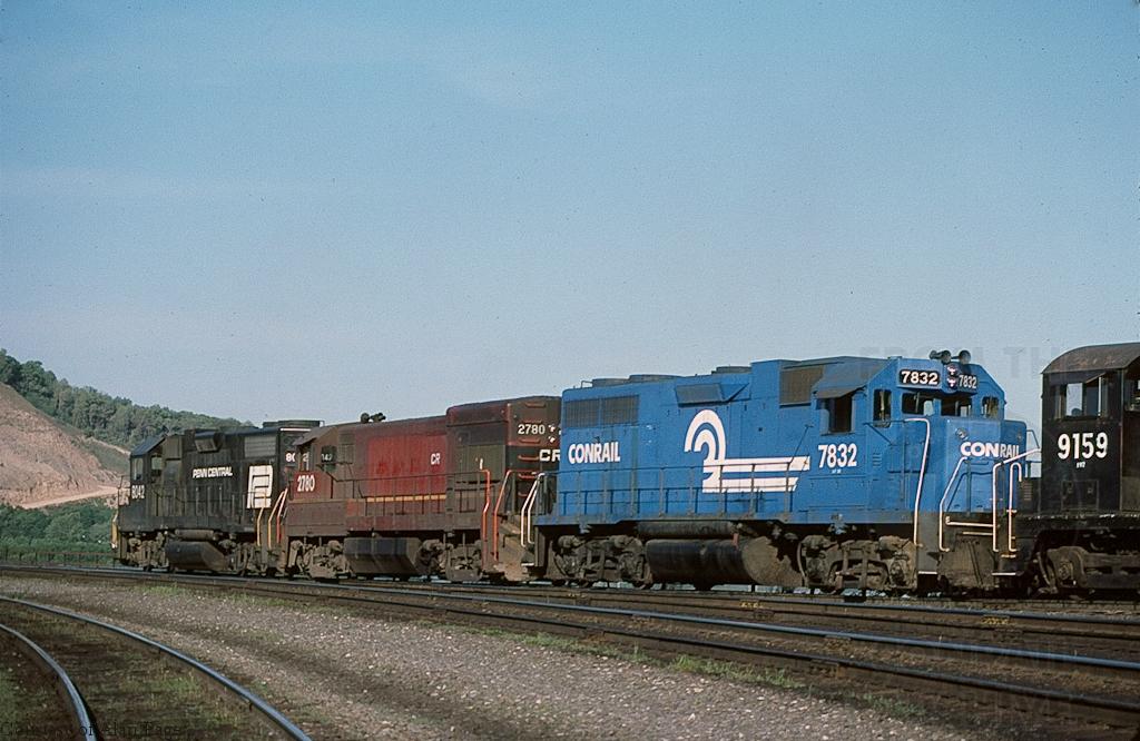 Former PC GP38-2 8042 leads U23B 2780 (ex-LV 504), GP38 7832, and NW-2 9159 across Rockville Bridge in June, 1977.