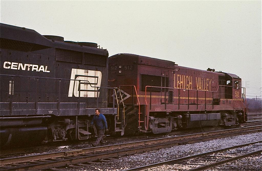 LV U23B 512 (LV's last of 12 U23B's inherited to Conrail) and PC GP-30 2238 worked Abrams yard and now prepare to depart with a mixed freight on a dark day in February, 1977