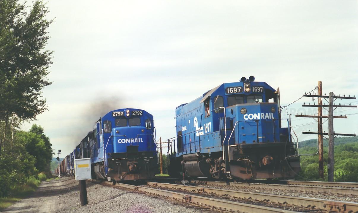 CR 2792, with SENH blows past GP15-1 1697 at the crossovers in Hinsdale, MA. The 1697 had just helped a westbound and is waiting for SENH to clear before crossing over and returning to West Springfield yard.