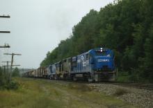 U30B 2834 with a westbound along Muddy Pond in Washington, MA. in Aug., 1979. The small concrete structure near the front of the locomotive once supported a water crane, there's another on the opposite side of the tracks.