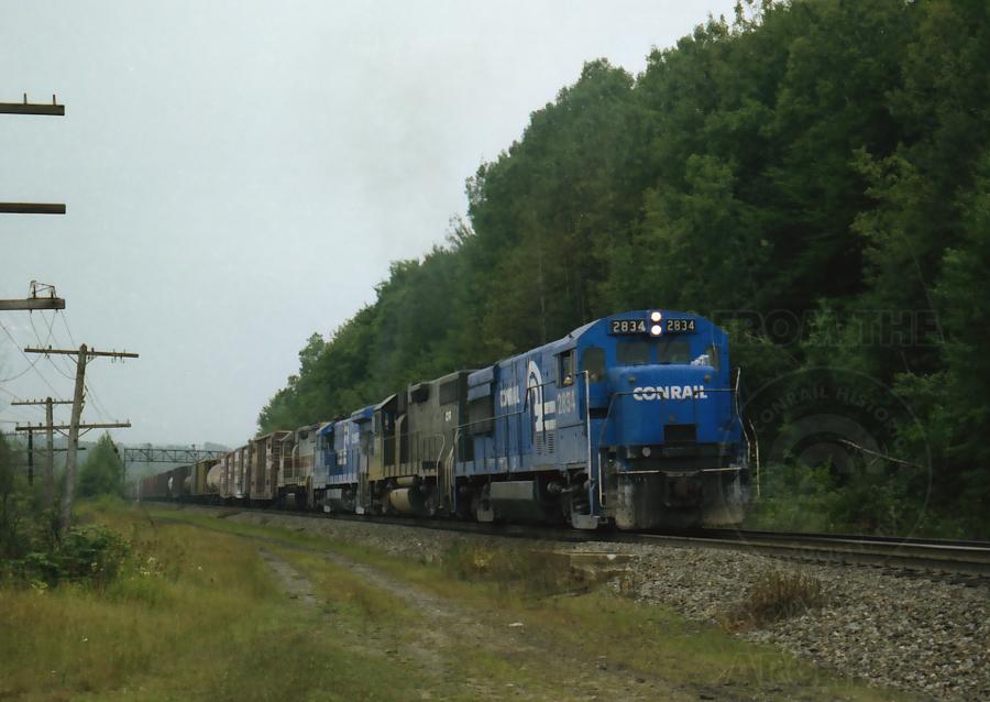U30B 2834 with a westbound along Muddy Pond in Washington, MA. in Aug., 1979. The small concrete structure near the front of the locomotive once supported a water crane, there's another on the opposite side of the tracks.