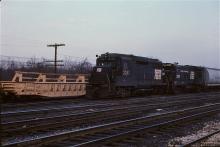 CR GP-30 2243 and U33B 2929 pass by RDG MOW gondola 96331 at Abrams yard in February, 1977.