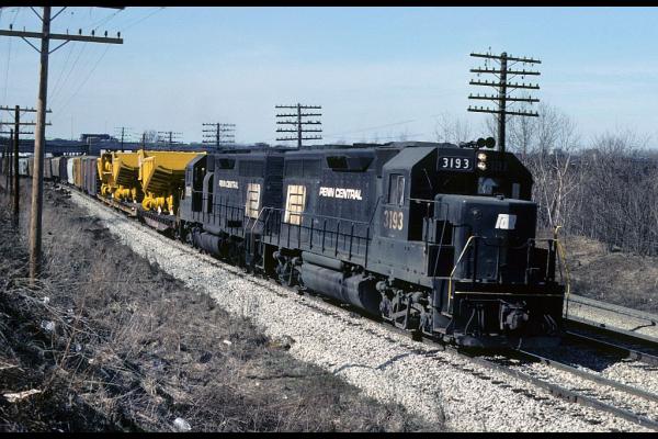 A quartet of EMD units led by ex-PC(NYC) GP40 3040 bring an eastbound TV around the curve at Bancroft, MA on the Boston Line during 1978.