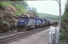 Conrail SD40-2 6461 and GP40 3052 (ex-PC 3052, nee-NYC 3052) are pulling an eastbound mixed freight into Gallitzin, PA in 1981.