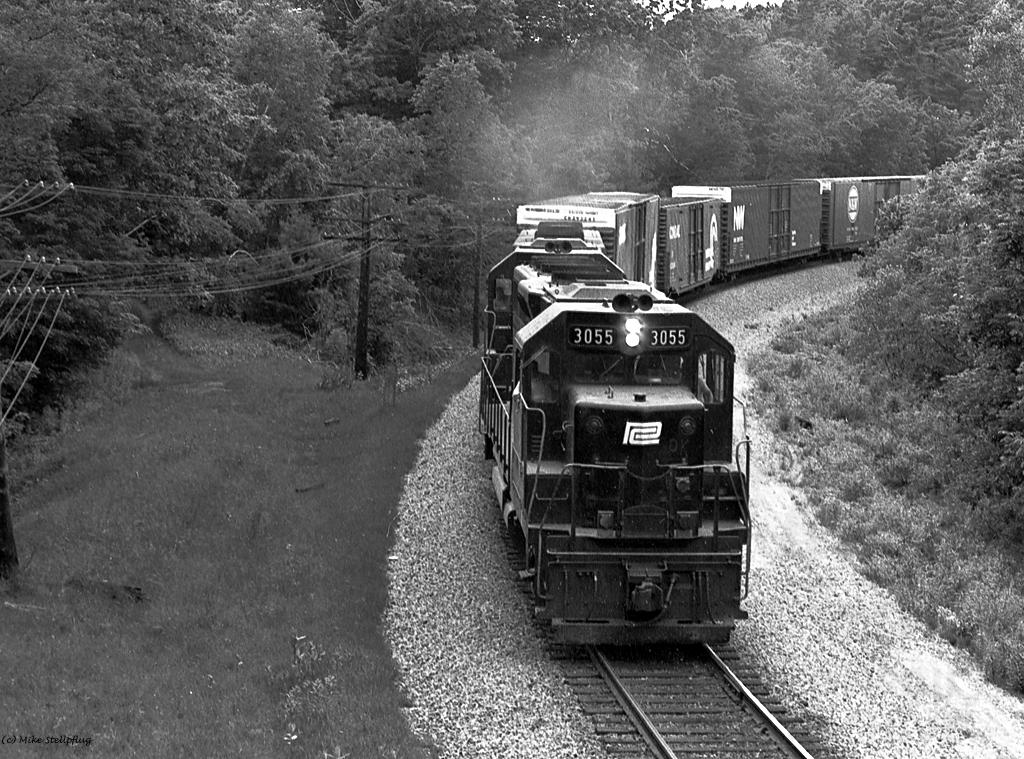 A pair of ex PC units lead an Eastbound around the curve at the West end of the Portage Bridge. The photo was taken from atop the Eastbound signal that once stood at the West end of the bridge. The new grade for the replacement bridge will probably swing over to the left and across the original grade that is visible under the pole line.