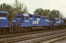 In front of CR U25B 2624, GP40 3099 runs third in a quartet of units pulling through Bethlehem in June, 1978.