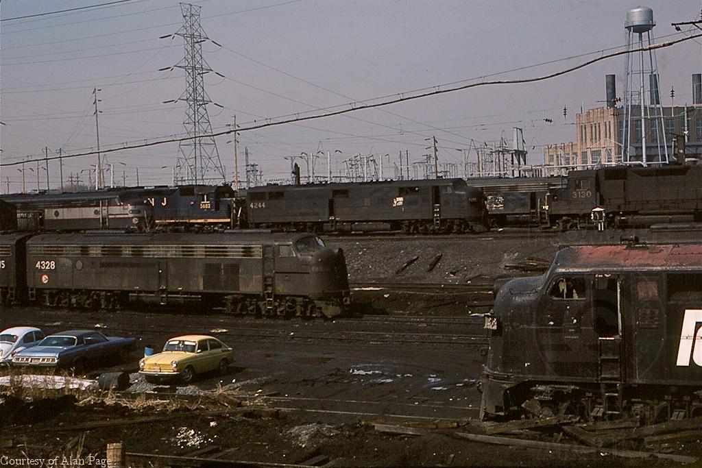 A busy engine terminal at South Amboy in March, 1978 shows E-7A 4244, E-8A 4328 and others, GP40P 3682 (CR 4111), and GP40 3130 lined up readying for service to South Amboy staton.