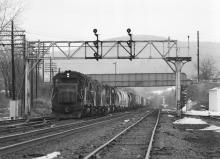 GP40 3153 arrives at North Adams Jct. in Pittsfield, MA. at 11:18 on Feb. 26, 1983. Sharp-eyed perusers may note the second and third units look like GP35's with the lower sills and smaller fuel tanks, also the fourth unit, a GP40(?), appears to have a bent frame.