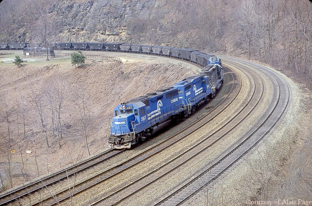 CR 3167 GP-40 leads GP-30 2194 and two other black and blue EMD SD's down Horseshoe Curve in March, 1981.