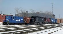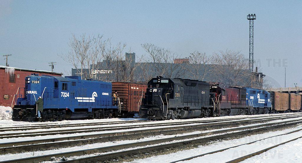 A variety of color can be seen in this 1978 view of a w/b on the former EL in Akron,Ohio as it passes a local with a fresh dip GP-9. I sure wish that ex LV unit had been leading.....