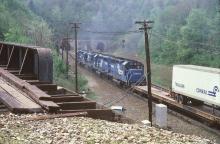 Conrail GP40 3212 is seen trailing on a westbound TV train as it prepares to duck into the Allegheny Tunnel at Tunnelhill, PA in 1986.