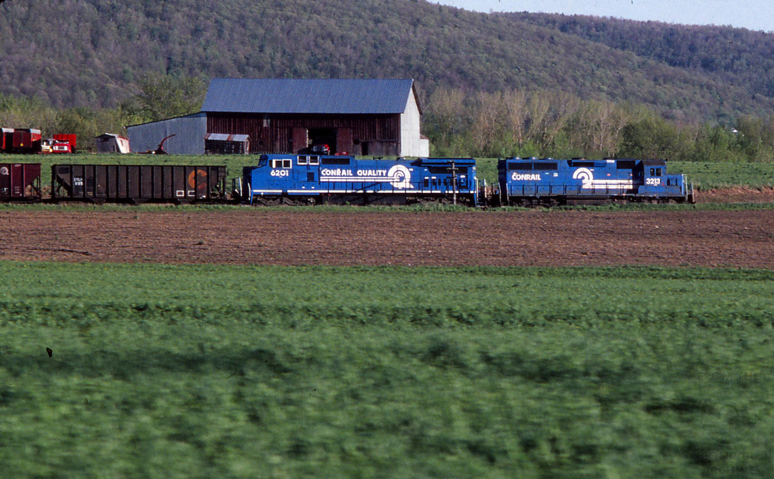 A UNG empty coal train from the NYSEG Goudy Station in Johnson City rolls through a bucolic Tioga County scene.