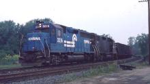 Conrail GP40 3216, with the PC logo showing thru on the long hood, leads still PC black GP38-2 on southbound extra local WHNO-99 at Northumberland, PA on 8/27/83. Train is heading to the Shamokin Dam power plant. The 3216 would live a long service life on Conrail being retired on 4/11/91 and then sold to the Ohio Central RR. The 8133 still toils on for owner CSX as its 2749.