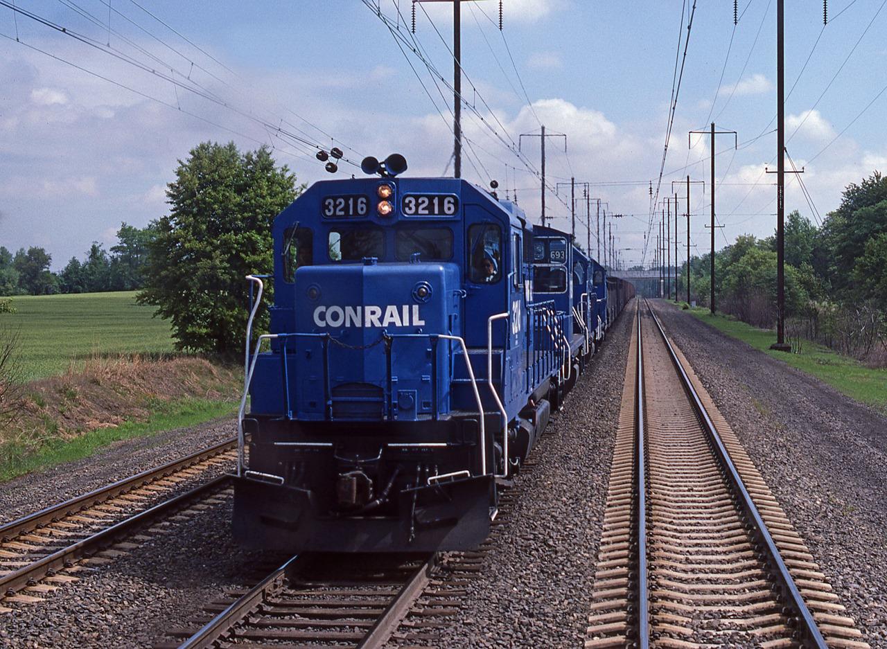 You're riding left side of Amtrak AEM7-934 on track two of the Northeast Corridor at MP 67.2. We're doing 125 MPH with N/B Washington, D.C. to New York City Northeast Regional train 164. We meet a S/B Conrail freight on track three. GP40-3216, an unknown switcher and GP15-1s 1693 & 1663 are on the point. 10:37AM on 5-12-85 in Aberdeen, MD.