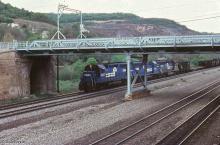 A westbound freight is being led by GP40 3247 (ex-PC 3247) through South Fork, PA in 1981. The train is passing under the old bridge that carried a road and streetcar tracks over the North Fork of the Little Conemaugh River.