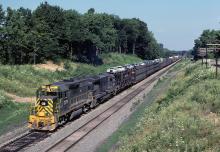 A nice treat this day was a former RDG GP40-2 leader on this e/b at Brady Lake, Ohio in August of 1978. This is the only higher up view I have of one of these, but traces of the roof number are visible under the loupe.