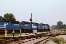 Railfans watch a detouring Conrail TV train take the signal to enter the B&OCT Barr Sub at State Line Tower in August 1983. The railfans are waiting for the passage of NW 611. The Barr Sub will be used to Pine Junction to reach Conrail's Chicago Line. The detours were necessary because Conrail's Calumet River bridge became stuck in the raised position. Doug Davidson photo with permission