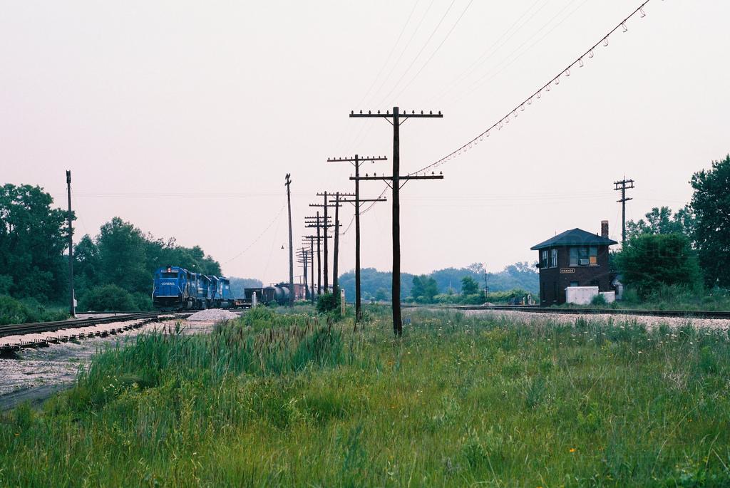 A westbound Conrail freight led by CR 3289 moves from Conrail's Porter Branch to the IHB at Ivanhoe Tower, in June 1992. Doug Davidson photo with permission
