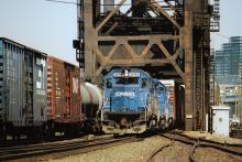 A pair of Conrail freights(one of which is led by GP40-2 3292) pass at Drawbridge (DB) on the Chicago Line's crossing of the Cuyahoga River on August 24, 1991. Doug Davidson photo with permission