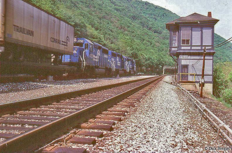 Conrail GP40-2 3292 is seen trailing on a westbound TV train at Jacks Tower in Jacks Narrows, PA in 1983.