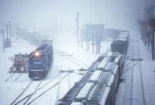 At dusk in a snowstorm, an Eastbound van train departs East Conway as a Westbound pulls into the yard,