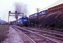 Back in 1979, a trio of new GP40-2s (including 3316 and 3324, both Phase II units built in May, 1978) keep an eastbound TV train in check as it descends "The Slide", a stretch of 2.37% grade that restricts trains to a maximum speed of 12 mph, due to the wreck of the Pennsy's Red Arrow on Feb 18th, 1947. That day, 24 people perished and more than a hundred were injured after the eastbound Red Arrow lost its brakes on the slide and jumped the tracks at Bennington Curve. The track beneath the overpass is the old New Portage secondary, a second route up the east slope that ran south out of Hollidaysburg via the much-less-famous Muleshoe Curve. Much of the old New Portage Secondary route is now used by the new alignment of US Route 22. Of particular interest is the first car in the train, one of the 86' double-level stock car that were seen ferrying delicious cows between yards in the Midwest and slaughterhouses in North Jersey and Philly until the early 1980s.
