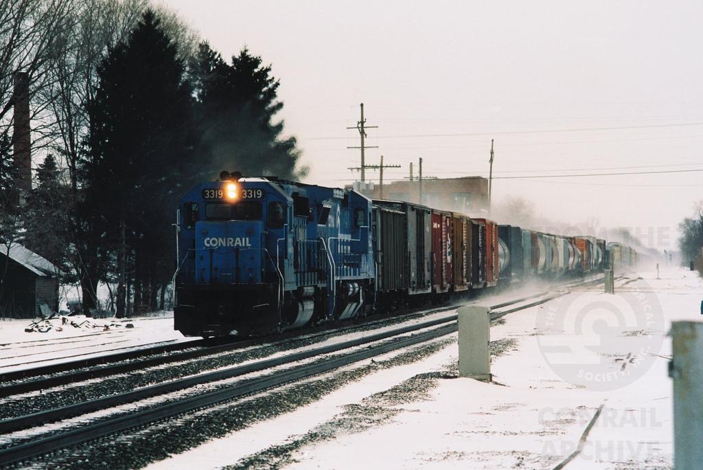 A westbound Conrail freight led by GP40-2 3319 makes its way through the snow belt of northwest Indiana at LaPorte, IN, in February 1991. Doug Davidson photo with permission