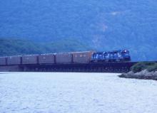 Three GP40-2's lead an autorack train across the Iona Island trestle at Bear Mountain State Park. Check out the open racks!!