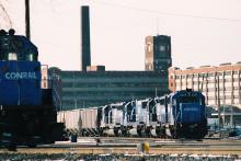 As SD50 6768 looks on, an eastbound Conrail grain train led by GP40-2 3327 awaits a crew change at Ashland Avenue Yard in February 1990. Doug Davidson photo with permission
