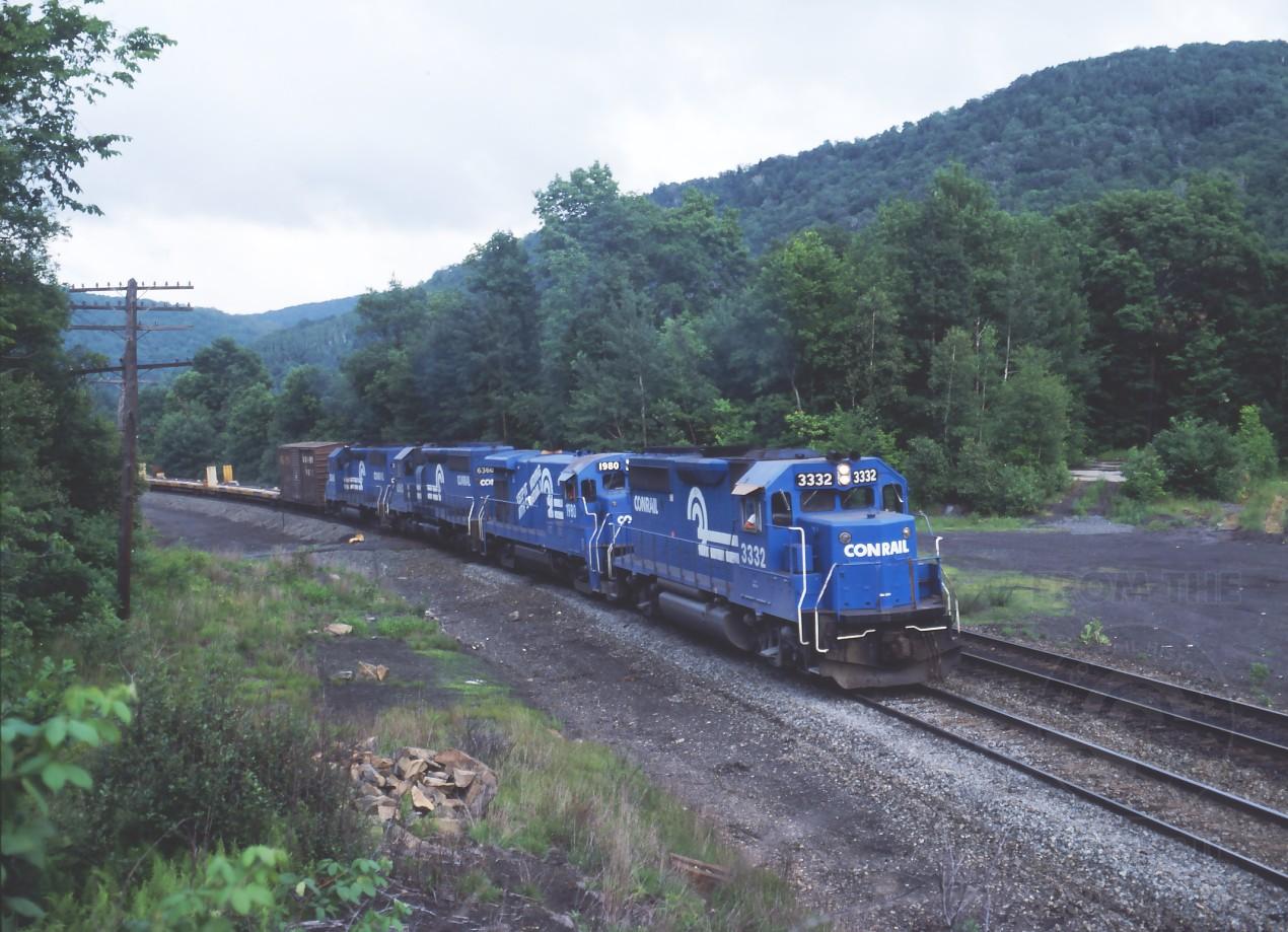 The 3332, with the "Keep it Moving with Conrail" B23-7 1980, head BOSE through Bancroft, MA. on July 3, 1981.