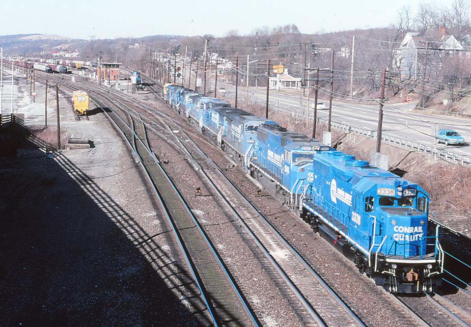 Freshly painted CR 3338 is seen leading a EB lite power move at East Conway PA on 2/7/98.