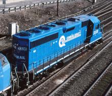 Freshly painted CR 3338 is seen at East Conway PA on 2/7/98.
