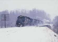 BOEL crossing the east branch of the Westfield River at MP 119 in Huntington, MA. on Jan. 16, 1982.