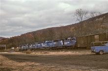 CR GP-40-2 3348 (2/1979 built) leads SD-40s 6240 (ex-PC) and 6317 (ex-PC 6064), and SDP-45 6683 (ex-EL 3652) through Spruce Creek, PA in November, 1980.
