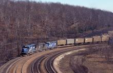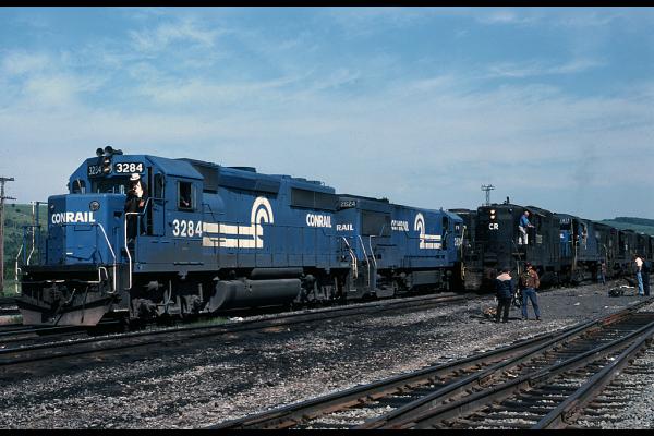 A WB Conrail TV Train grinds upgrade at Bennington, PA on 4/19/80 w/ a GP40-2, a U25B and a GP40. The U25B was making more racket than the two GP40s combined. The top of the east end of the cut at Bennington was always a good place to appreciate "stack talk," and the U25Bs always put on a show.