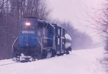 WACG 30 rolls east on the ex Erie Rochester Branch, now the Bath Secondary, passing Savona with a single GP 40-2 and two cars, one an LP gas car returning empty to Gang Mills.