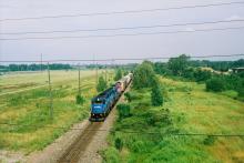 In a view through the electrical lines, a westbound Conrail freight behind GP40-2 No. 3363 skirts the vacant space that used to be Bison Yard on the former EL, in August 1997. Doug Davidson photo with permission