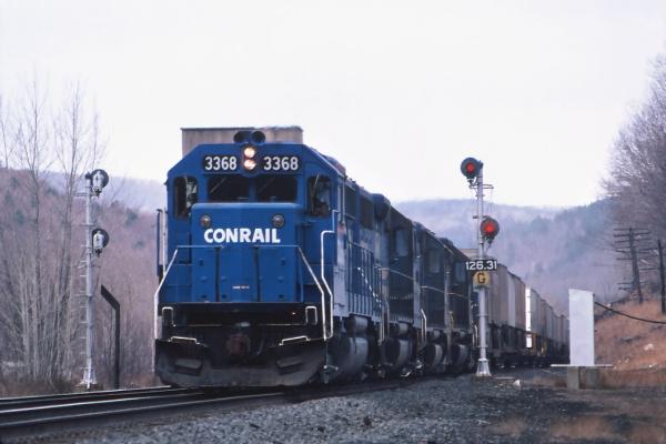 WB TV Train passing MG Tower w/ GP40-2 No. 3364 and two other units. MG Tower, PA. 9/8/84