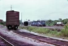 East Side B&O yard, RG Tower, Reed Street Bridge is in background. South Philadelphia, PA yard. GP40-2 #3367 & SD45 in the yard. This yard is shared with Conrail & Chessie System. August 17, 1979
