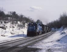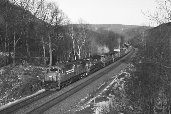 BOEL boils out of the big cut at Washington depot, MA. behind the 3383, et al. on Feb. 27, 1982.