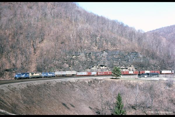 CR 3398 leads a westbound intermodal train around the curve at Thompsontown, PA on Oct. 12, 1989