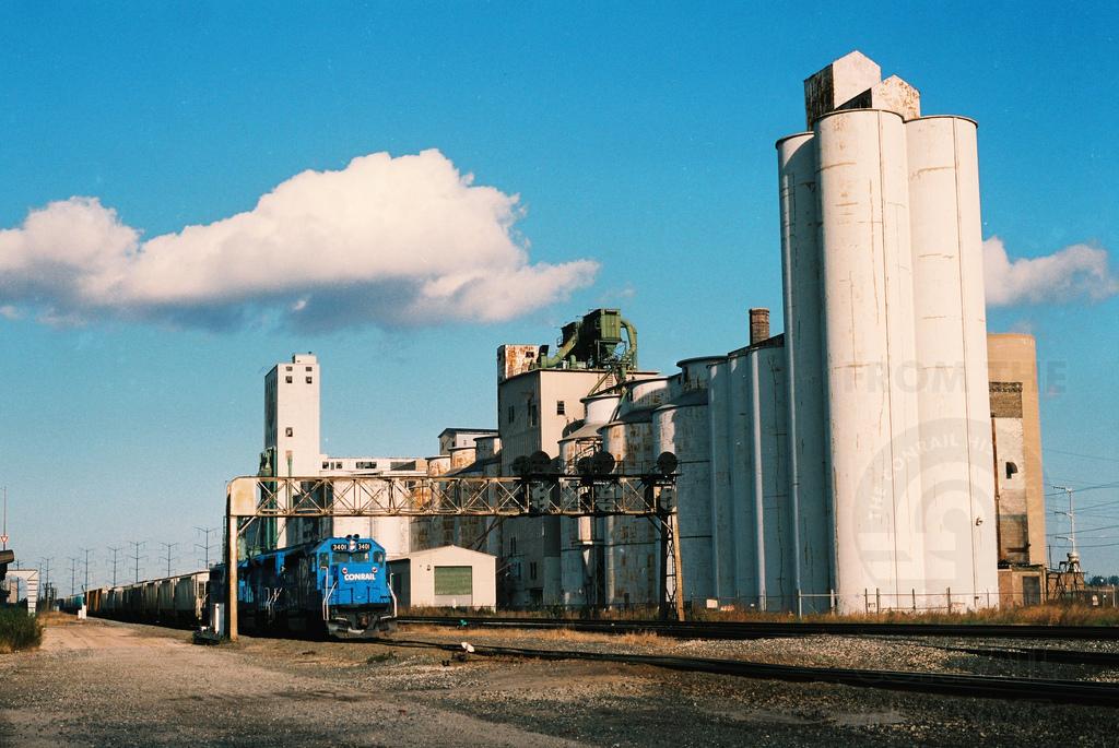 Eastbound Conrail train led by GP40-2 3401 is leaving Illinois and entering Hammond, IN as the Falstaff elevator looms behind. The train is shown entering Colehour Yard to perform some switching before continuing its eastward journey in November 1986. Doug Davidson photo with permission