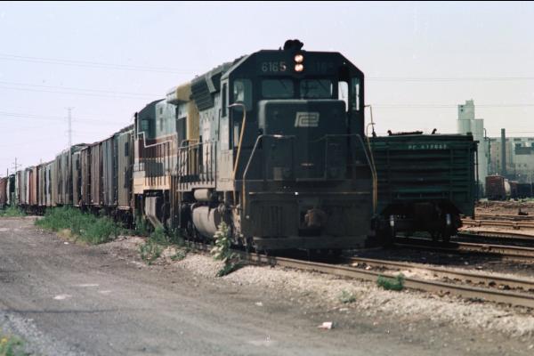 Eastbound Conrail train led by GP40-2 3401 is leaving Illinois and entering Hammond, IN as the Falstaff elevator looms behind. The train is shown entering Colehour Yard to perform some switching before continuing its eastward journey in November 1986. Doug Davidson photo with permission