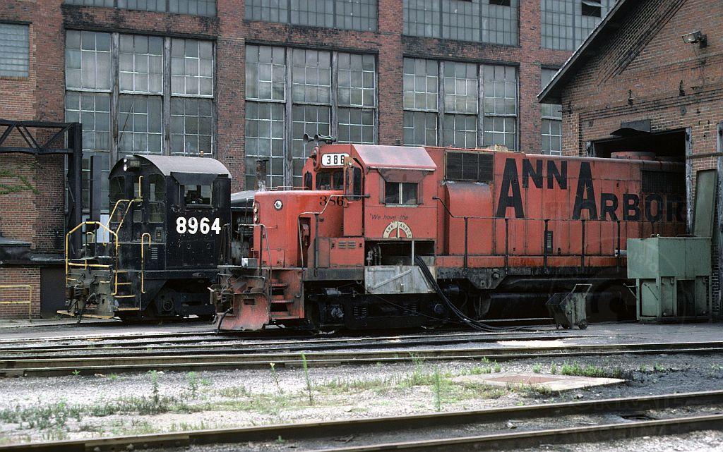 What's that you say...Conrail 3611?? It seems the Ann Arbor's 10 GP35's were assigned CR numbers, but late in the game the State of Michigan took the Annie to keep it out of Conrail's hands- and probably saved it from an early demise. Those Alco trucked EMD's did see time running on Conrail though as witnessed by AA 386- it would have been CR 3611- getting some work done to it at the Collinwood shops in Cleveland. Pairs of Annie 35's would also run from the sand pits located on the Ann Arbor railroad on the "sand man" to the Ford Brookpark engine casting plant near Rockport yard in Cleveland. A former Penn Central SW-9 keeps this "almost Conrail" unit company this August 1976 day. Today's AA still rosters 3 ex Conrail GP38's in it's "fleet", the 386 was scrapped several years ago.